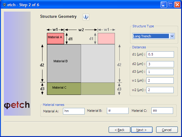 A simple GUI has been developed based on a 6-step wizard where the user defines the geometry to be etched, the species in the gas phase, the surface chemistry, numerical and other parameters of the simulation. The second step of the wizard, where the user defines the dimensions of the structure to be etched, is shown below.